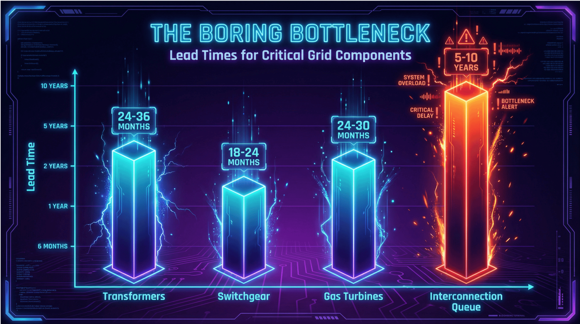 Transformer lead times have stretched to 24-36 months, switchgear to 18-24 months, and gas turbines to 24-30 months. But the most alarming bottleneck is the interconnection queue itself, which can stretch 5-10 years in some regions. This isn't a temporary supply chain hiccup; it's a structural constraint that will define winners and losers in the energy transition.