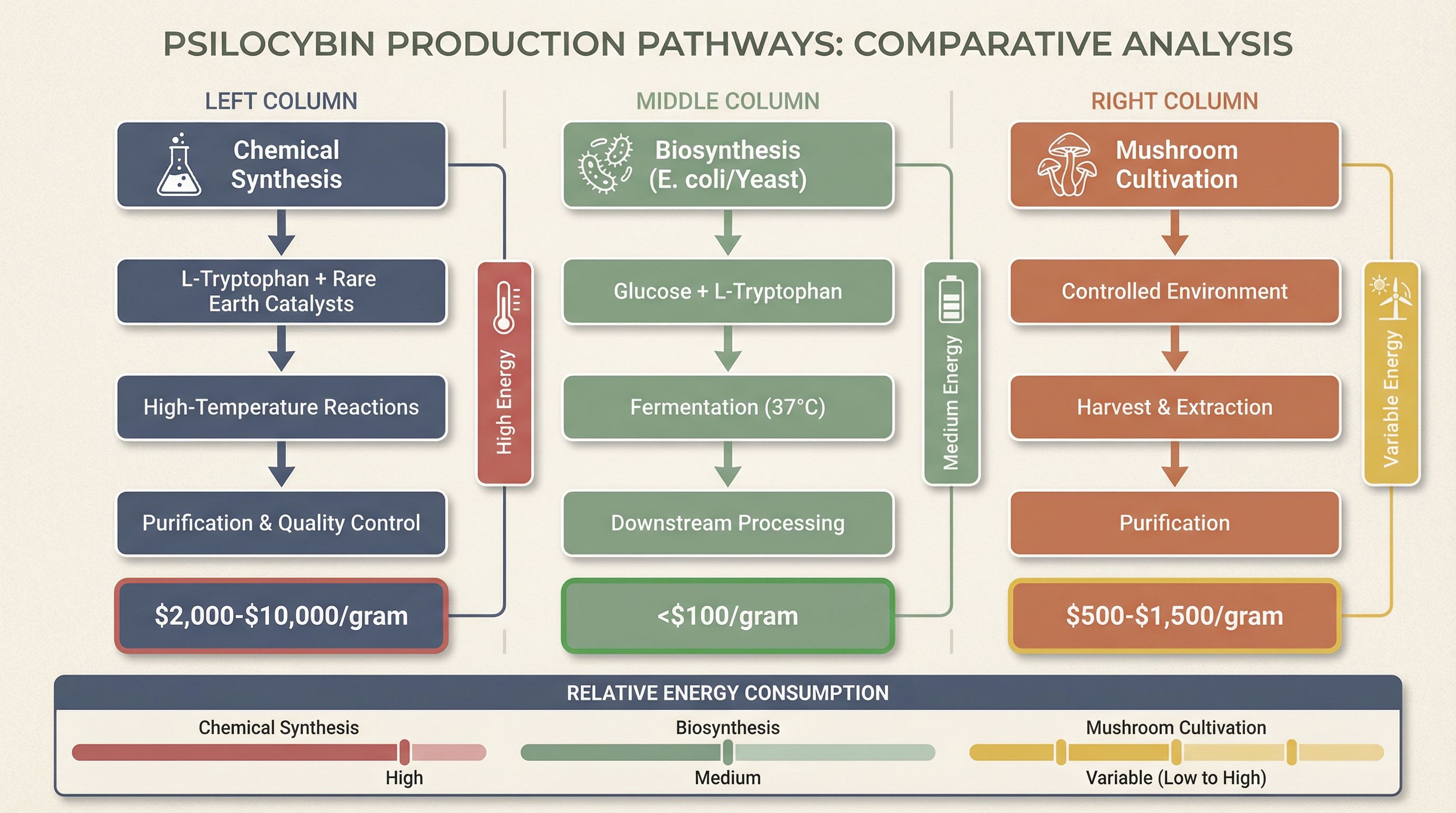 The path from laboratory curiosity to mainstream cognitive enhancer requires solving a fundamental industrial challenge: how do you produce pharmaceutical-grade psilocybin at scale, at cost, and with acceptable energy efficiency? Three competing production methods are emerging, each with radically different energy footprints and commodity requirements.
