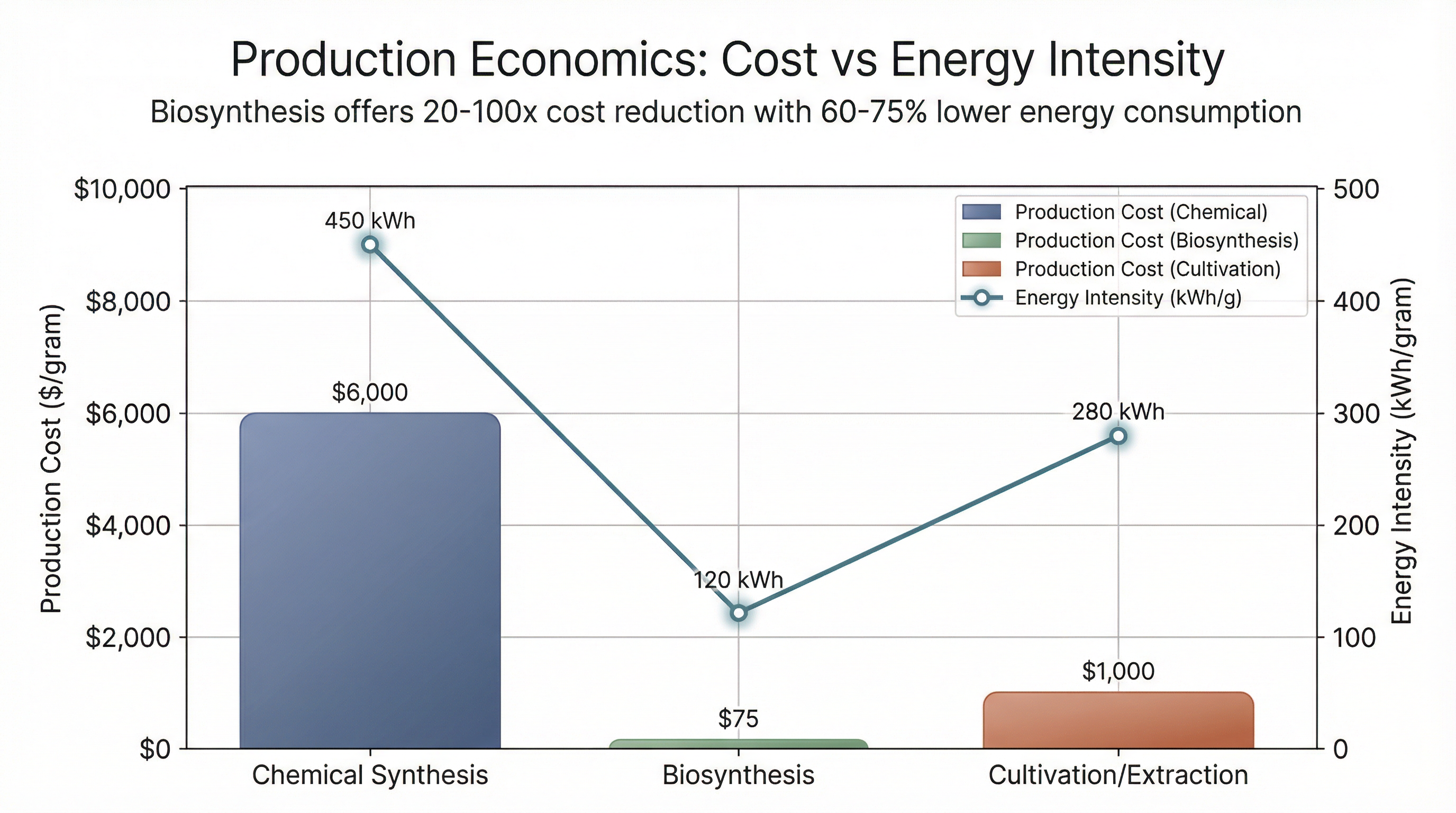 The key commodity input is L-tryptophan, the precursor amino acid with an estimated annual market potential of 11,000 tons. Biosynthesis routes consume electricity for fermentation equipment and climate control, but eliminate the need for rare earth catalysts and high-temperature reactions. The economic advantage is stark: production costs can drop below $100 per gram, a 20x to 100x reduction compared to chemical synthesis.